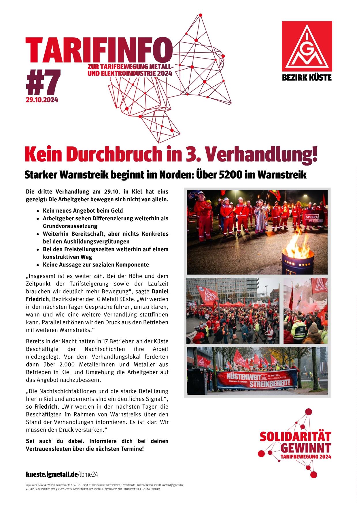 „Insgesamt ist es weiter zäh. Bei der Höhe und dem Zeitpunkt der Tarifsteigerung sowie der Laufzeit brauchen wir deutlich mehr Bewegung“, sagte Daniel Friedrich, Bezirksleiter der IG Metall Küste. „Wir werden in den nächsten Tagen Gespräche führen, um zu klären, wann und wie eine weitere Verhandlung stattfinden kann. Parallel erhöhen wir den Druck aus den Betrieben mit weiteren Warnstreiks.“